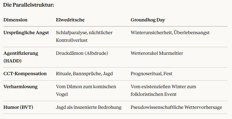 Das HADD-CCT-BVT-Modell ist ein hochmoderner und interdisziplinärer Ansatz. Es leistet Folgendes: Es macht die Elwedritsch von einer „ausgedachten Lüge“ zu einem echten psychologischen Phänomen. Es bietet eine logische Kette von der Biologie (Schlafparalyse) über die Psychologie (Angstbewältigung) bis hin zur Kultur (Humor/Brauchtum). Es erklärt die Langlebigkeit des Mythos: Die Elwedritsch ist nicht verschwunden, sondern hat sich erfolgreich in unsere moderne, humorvolle Kultur transformiert (Memetik). Insgesamt ist dieses Modell die bisher schlüssigste Erklärung dafür, warum die Elwedritsch in der Pfalz (und auch in Pennsylvania als Elbedritsch) eine so tiefe kulturelle Identität besitzt.