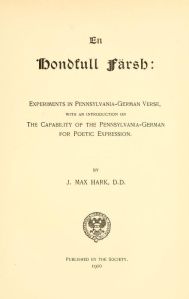 J. Max Hark (1849-1930) waar in Nazareth (PA) gebore un waar en Herrnhuter. Im Oktower 1899 hot er en paar Gedichte vorgelese bei en Versammling vun die Pennsylvania German Society. Die Leit henn’s gegliche, un so hot die Society en Bichli gedruckt in 1900: “En Hondful Faersh”. Der J. Max Hark hot weise welle, ass mer net yuscht gschpassiche Sache schreiwe kann in die Mudderschprooch. Der HwD Drucker gleicht abbadich die Schticker “Der schpoode Schulbu” un “Wann der Wind mol iwwer die Schtobble bloost”. Guckt yuscht mol nei. Sell Bichli kennt dihr nau aa online lese: