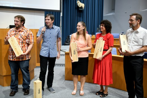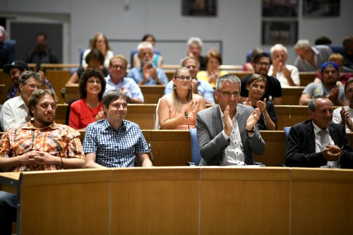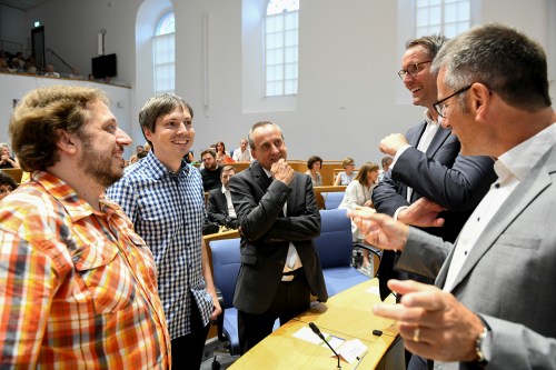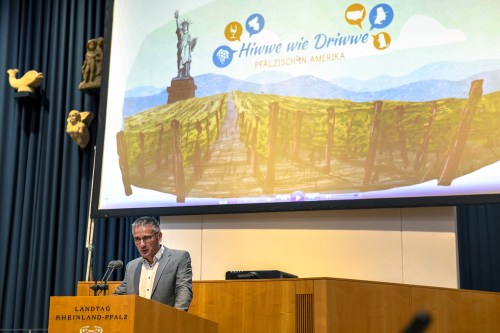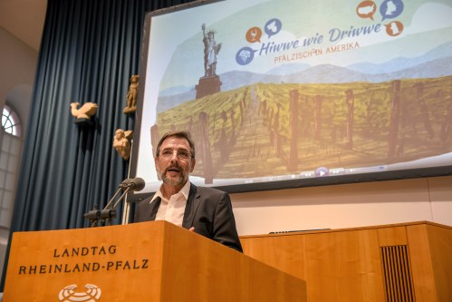 Der Christian Schega un der Benjamin Wagener henn ihr Documentary “Hiwwe wie Driwwe – Pfälzisch in Amerika” faddich grickt in 2018. ‘S erscht mol abgewisse zu Leit henn sie ihr Project im State Parliament vun Rheinland-Pfalz (Landtag) in Mainz am 7. Augscht. ‘S waare meh wie 120 Leit Leit, un ‘s scheint, ass sie sell Documentary abbadich gegliche henn. En “Wilkum” gewwe hot der Hendrik Hering, President vum Parliament, un der Michael Werner hot gschwetzt iwwer die Verbinning vun die paelzer un pennsylvanisch-deitsche Leit. Noht hot’s noch en Interview gewwe mit die Ashley Snyder (Robesonia, PA) un Prof. Mary Laub (Kutztown, PA), ass aa datt waare. (Alle Pickters: Landtag / Dr. Andreas Linsenmann)
