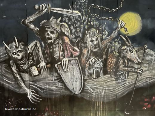 Un sellerweg hemmer’s geduh. Mer henn rielli en guudi Zeit ghatt – aafangs – un en latt gelacht un gedrunke. Un mer henn gflucht, wie yuscht yungi Leit fluche kenne, wammer emol net gewunne henn beim Kaarde schpiele. So iss des aagange fer en ganzi Weil. Un wie der Jonas die Schteg nunnergange iss fer en neie Flasch Applejack hole, henn der Donnie un ich nochemol laut gelacht, wie mer an die Weibsleit Schtoris gedenkt henn: Ass die Gschpucke, ass drauss erum gehne in selli Daage zwischich Grischtdaag un die erscht Woch vum Yenner, des heere kenne, wammer sich net behaeft, wie mer sett in die ruhich Zeit. Ass mer yuscht in die Schtubb bleiwe sett, kenn Wesch wesche un uffhenke, nix schaffe, un ass sich kenn Rad drehe sett. Ass mer uffbasse sett, wammer mol naus muss. Weil en grosser Drupp Gschpucke – die Wilde Yagd – en Ride nemmt darich die Luft in seller Zeit un aardlich Yacht macht, so ass mer denkt, hunnert Deifel kaemde fer ehm hole zamme mit viele dausend doote Seele, ass mit ziehge misse, weil sie kenn Ruh finne kenne. Un ass mer acht gewwe sett, wammer drauss iss, ass die Gschpucke ehm net mit ziehge in die Luft un mitschleefe – fer alli Ewichkeet!
