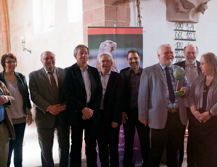 Roland Paul (Mitte) 2015 in Bockenheim bei der Verleihung des Emichsburg-Preises an den Vorstand des Deutsch-Pennsylvanischen Arbeitskreises e.V.: Von links Heike Benß, Bgm. Kurt Janson, Sänger John Schmid (Berlin, OH), Roland Paul, Dr. Michael Werner, Frank Kessler, Volker Gallé und Doris Schweitzer
