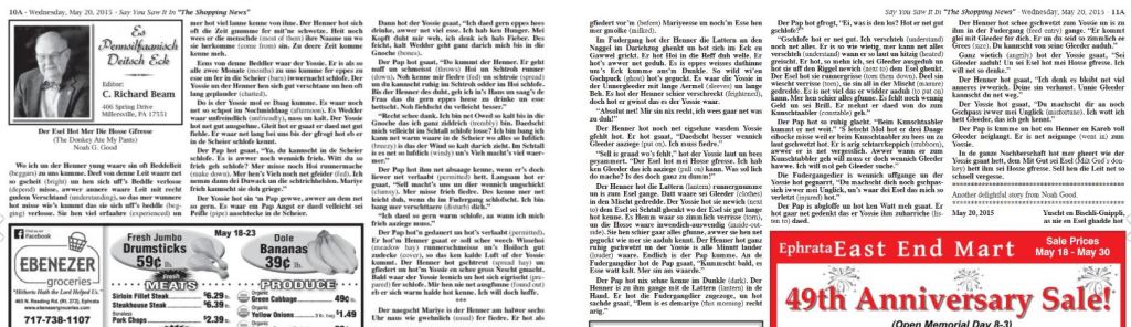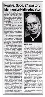 Mit Noah G. Good hatte ich seit 1993 im Briefverkehr gestanden. Er war in seinem Arbeitsleben Schulleiter einer mennonitischen Schule in Lancaster County gewesen, war ein recht bekannter mennonitischer Prediger und schrieb immer wieder Geschichten in Pennsylvania-Deutsch im „Mennonite Quarterly“. Deshalb lernten wir uns kennen.