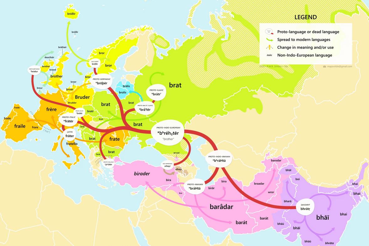 Wenn man sich die verschiedenen Varianten des Wortes “Bruder” in den diversen indoeuropäischen Sprachen ansieht, wird der kulturhistorische Zusammenhang der verschiedenen Sprachgruppen deutlich. Es wäre jedoch zu kurz gegriffen zu glauben, dass bei der Wanderung der indoeuropäischen Völker über einen Zeitraum von vielen tausend Jahren nur die Sprache in immer neue Räume transportiert wurde, wo sie dann von den einzelnen Gruppen jeweils verändert wurde. Auch andere kulturelle Muster – Bräuche, Speisegewohnheiten und religiöse Rituale – waren selbstverständlich im Gepäck und haben sich in den Zielregionen der Wanderungen dann eigenständig weiterentwickelt.
