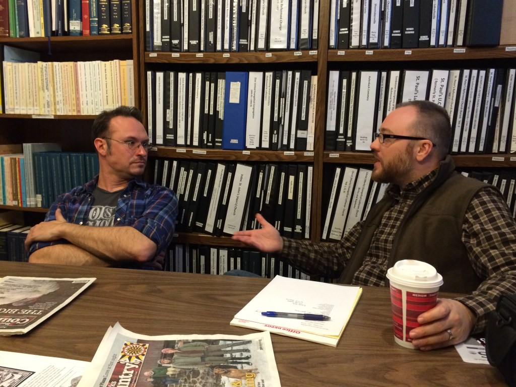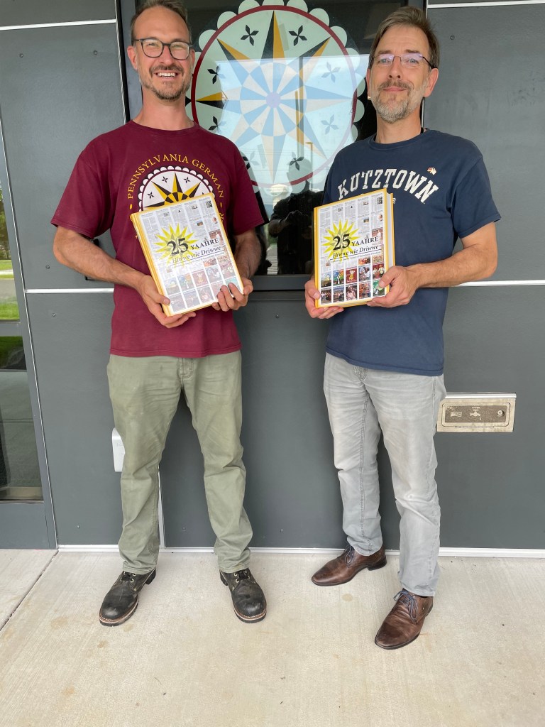 Ich bin nicht mehr sicher, wann mir Patrick zum ersten Mal begegnet ist. Es müsste im Jahr 2007 gewesen, als ich Ed Quinters Dialektklassen in Kutztown besuchte – man kann dort „Pennsylvania German“ im Nebenfach studieren. Vermutlich saß Patrick da in einer der Reihen unter den Studierenden. Ein Foto aus dieser Zeit habe ich nicht gefunden. Etwa 2011 wurde er Assistent von Prof. Rob Reynolds, dem damaligen Chef des Heritage Centers. Nach dessen Weggang übernahm er 2013 die Leitungsfunktion. Seit diesem Zeitpunkt arbeiten wir beim Projekt „Hiwwe wie Driwwe“ eng zusammen, und seit 2021 ist er Mitherausgeber der Zeitung.