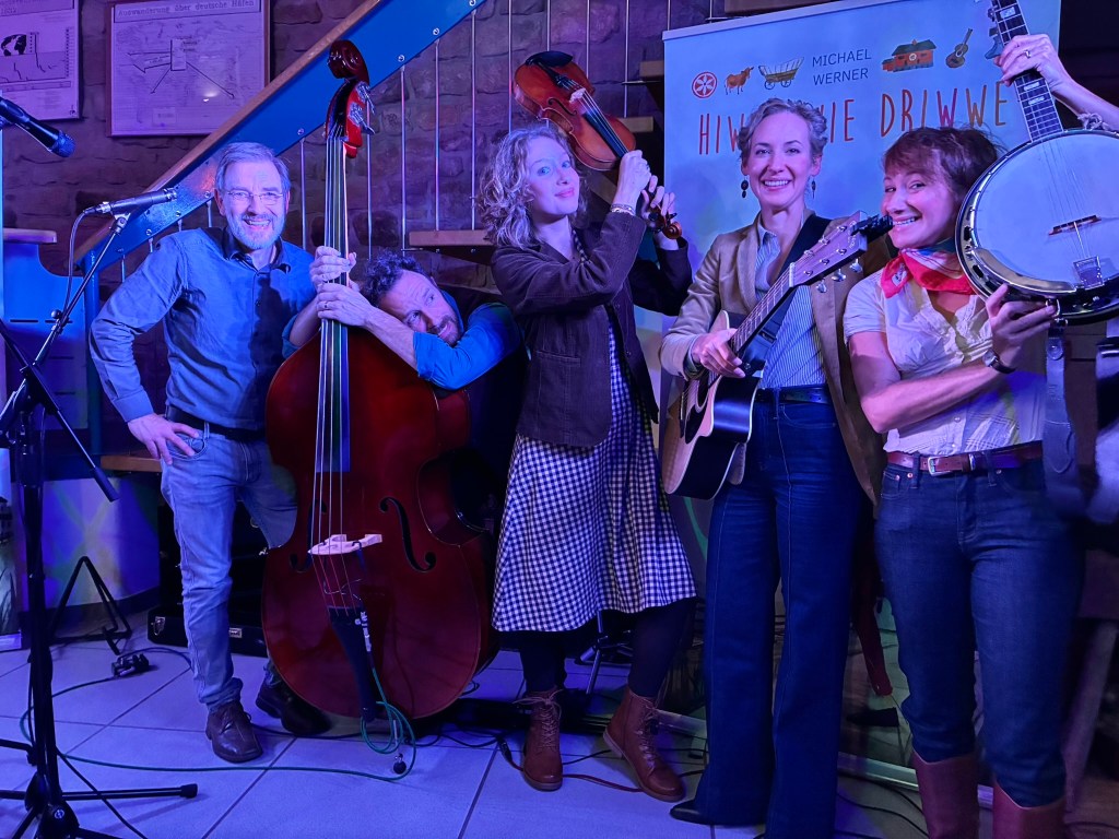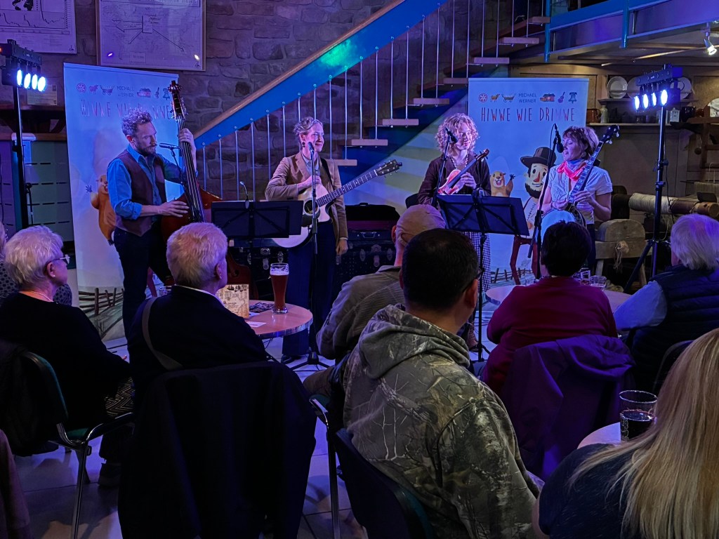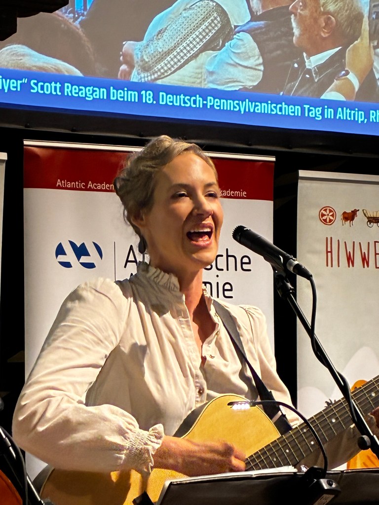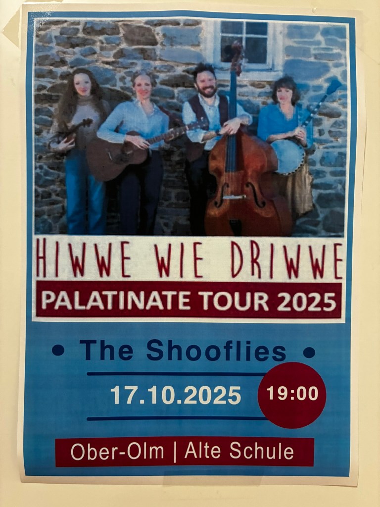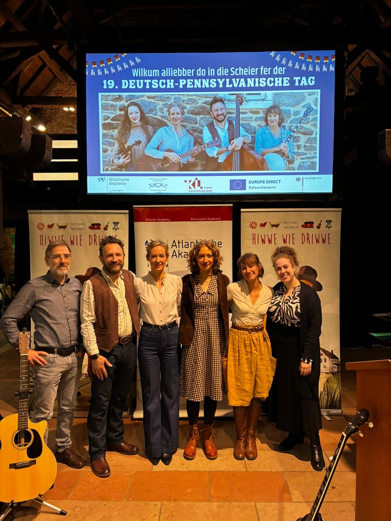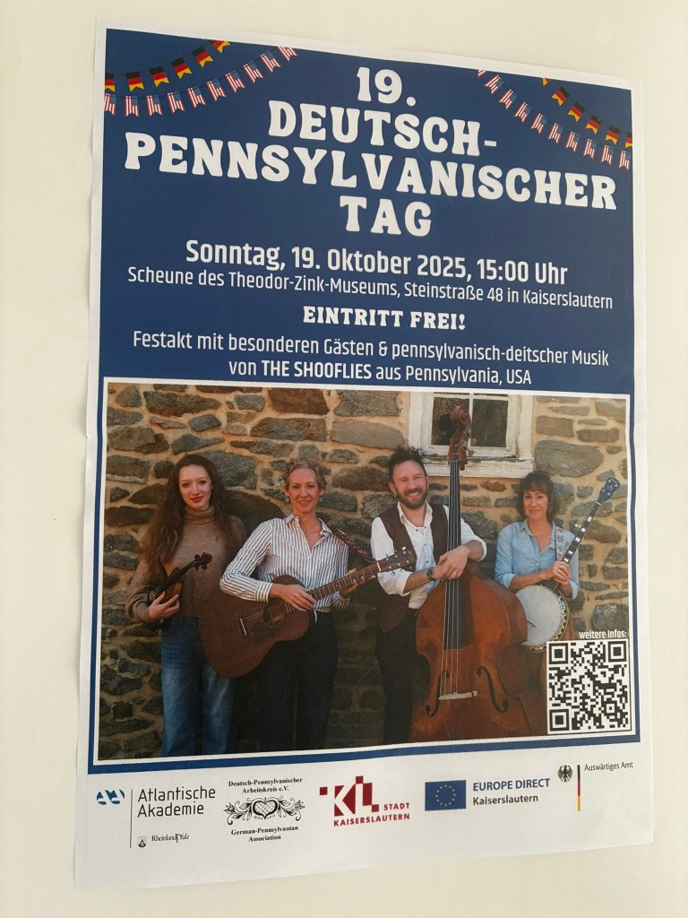 So reisten Brigitte Weinsteiger, Erika und Pete Gustavson im Oktober 2025 mit vier Töchtern in die Pfalz. Die Älteste, Adelaide Gustavson, spielt in der Band Geige. Die jüngeren Mädchen wirken bei einzelnen Songs mit. Und, was soll ich sagen: Sie eroberten die Herzen der Pfalz im Sturm. Mehr als 700 Menschen kamen zu ihren Konzerten in Oberalben, Ober-Olm, Bockenheim, Altrip und Kaiserslautern. Und in Kaiserslautern beim 19. Deutsch-Pennsylvanischen Tag kamen sogar so viele, dass etwa 70 Personen aus Brandschutzgründen keinen Einlass mehr fanden. Die “Hiwwe wie Driwwe Palatinate Tour 2025” war ein voller Erfolg, und viele fragen schon, wann die Band wieder kommt.