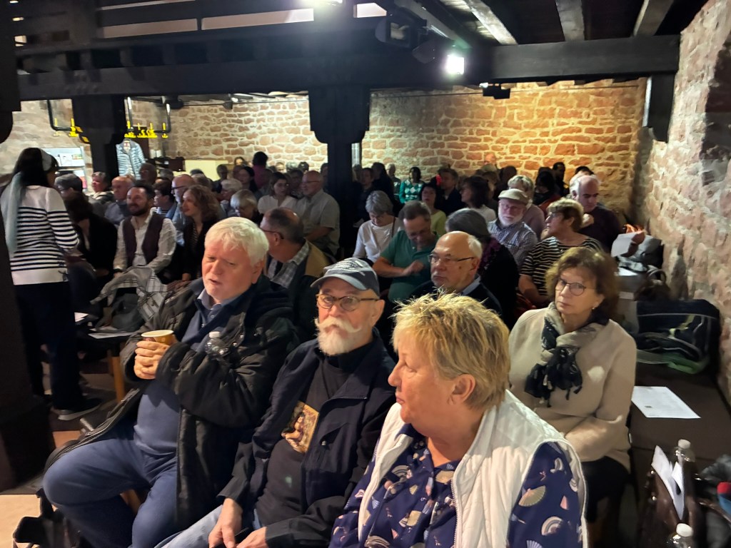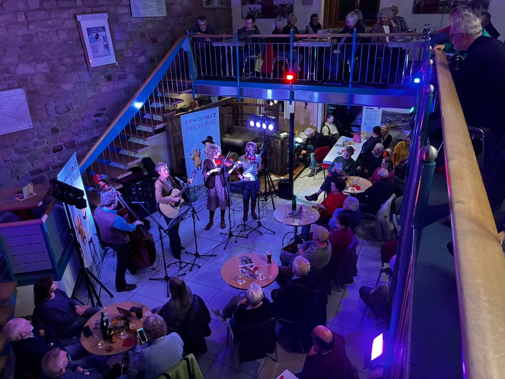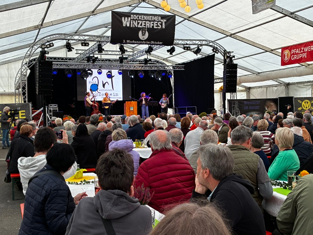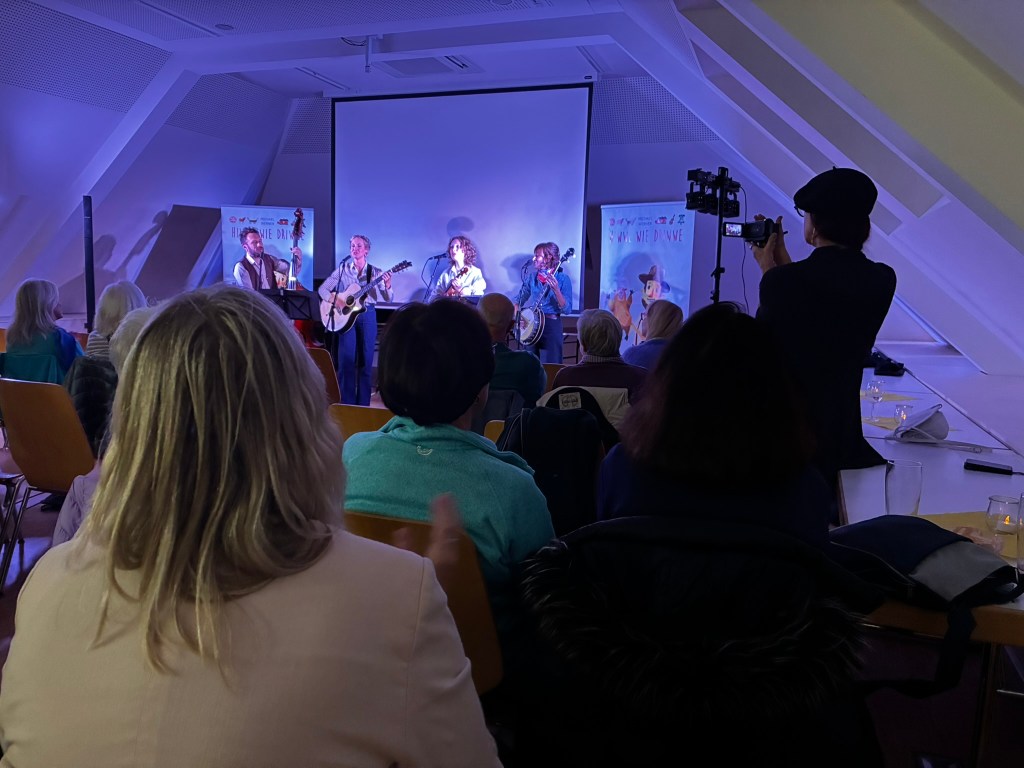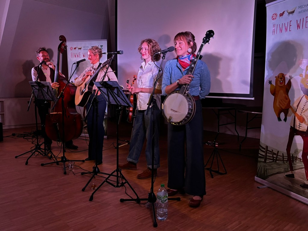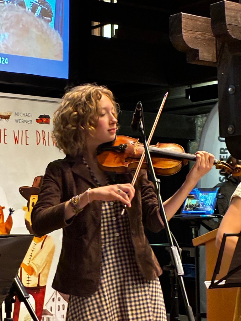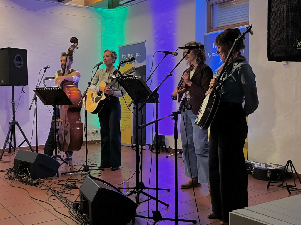 So reisten Brigitte Weinsteiger, Erika und Pete Gustavson im Oktober 2025 mit vier Töchtern in die Pfalz. Die Älteste, Adelaide Gustavson, spielt in der Band Geige. Die jüngeren Mädchen wirken bei einzelnen Songs mit. Und, was soll ich sagen: Sie eroberten die Herzen der Pfalz im Sturm. Mehr als 700 Menschen kamen zu ihren Konzerten in Oberalben, Ober-Olm, Bockenheim, Altrip und Kaiserslautern. Und in Kaiserslautern beim 19. Deutsch-Pennsylvanischen Tag kamen sogar so viele, dass etwa 70 Personen aus Brandschutzgründen keinen Einlass mehr fanden. Die “Hiwwe wie Driwwe Palatinate Tour 2025” war ein voller Erfolg, und viele fragen schon, wann die Band wieder kommt.
