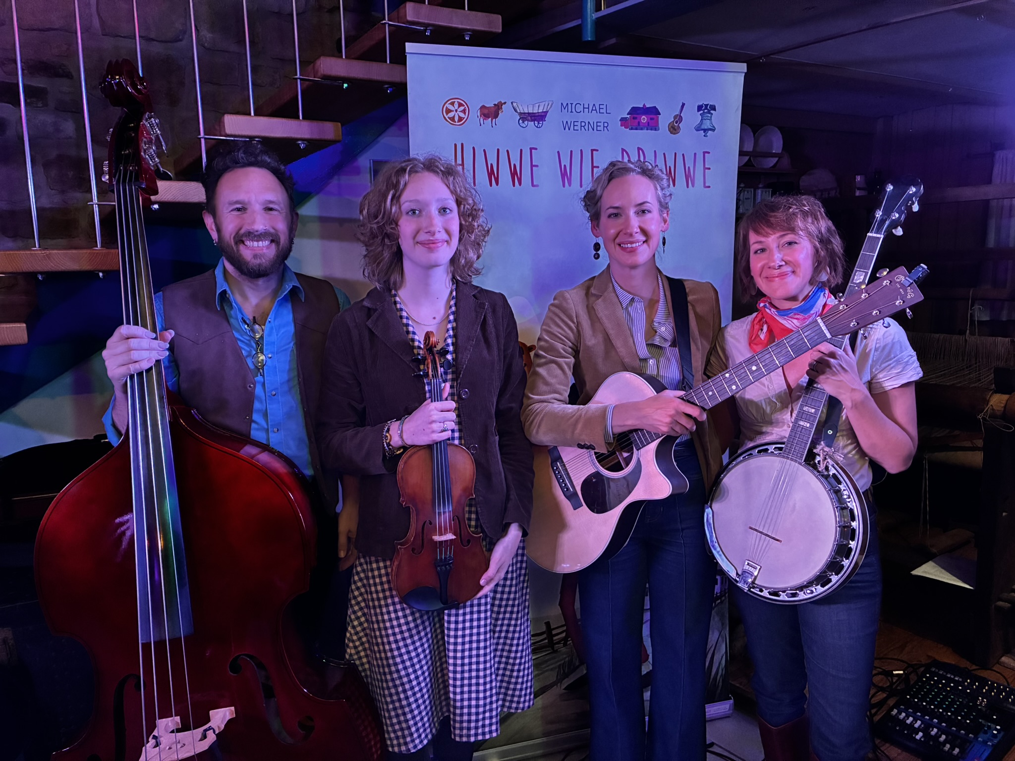 So reisten Brigitte Weinsteiger, Erika und Pete Gustavson im Oktober 2025 mit vier Töchtern in die Pfalz. Die Älteste, Adelaide Gustavson, spielt in der Band Geige. Die jüngeren Mädchen wirken bei einzelnen Songs mit. Und, was soll ich sagen: Sie eroberten die Herzen der Pfalz im Sturm. Mehr als 700 Menschen kamen zu ihren Konzerten in Oberalben, Ober-Olm, Bockenheim, Altrip und Kaiserslautern. Und in Kaiserslautern beim 19. Deutsch-Pennsylvanischen Tag kamen sogar so viele, dass etwa 70 Personen aus Brandschutzgründen keinen Einlass mehr fanden. Die “Hiwwe wie Driwwe Palatinate Tour 2025” war ein voller Erfolg, und viele fragen schon, wann die Band wieder kommt.