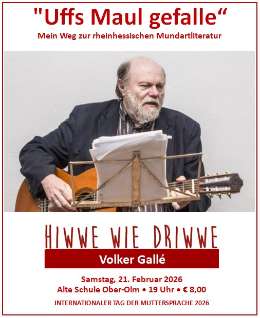 Zum UNESCO TAG DER MUTTERSPRACHE 2026 veranstaltet die Gemeindebücherei Ober-Olm in Zusammenarbeit mit “Hiwwe wie Driwwe” einen exklusiven Mundart-Abend mit „Mr. Rheinhessen“: Volker Gallé. Die Veranstaltung bildet gleichzeitig den Auftakt zum neuen „Mundartfestival Rheinhessen 2026“, das mit mehreren Veranstaltungen im Februar/März 2026 über die Bühnen der Region geht.
