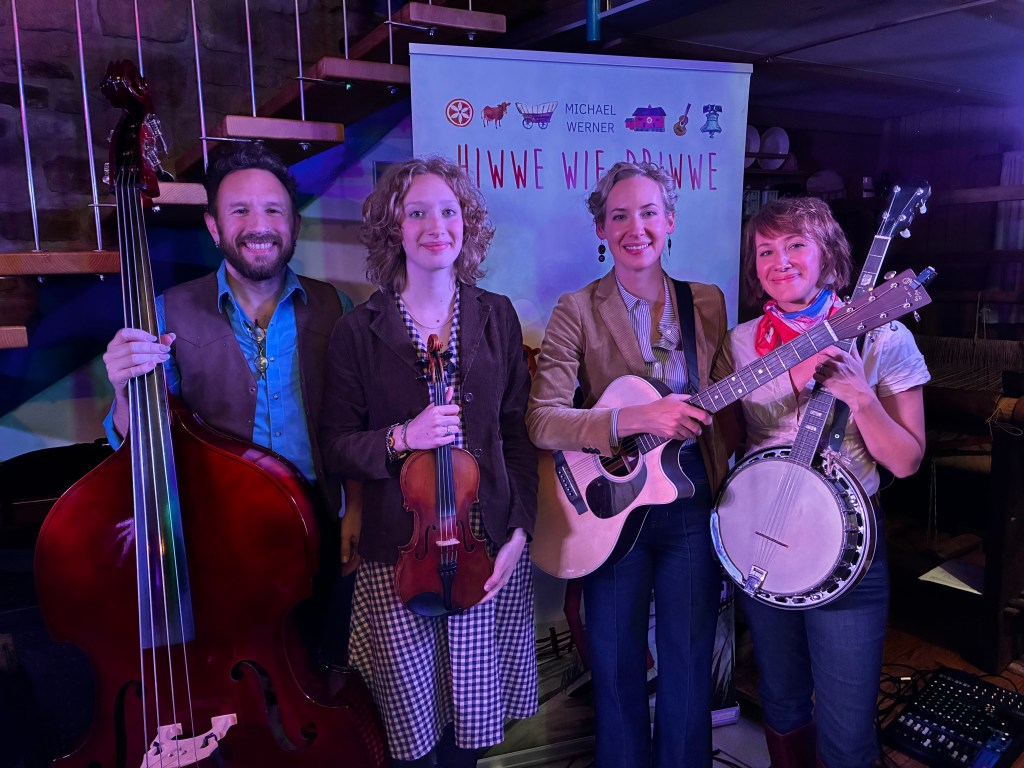 Im Summer 2022 bin ich beim Kutzeschtettel Folk Fescht gwesst. Sell waar ferschur en aardlich guudi Zeit. Ich hab Musik gschpielt uff die “Main Stage” alleenich un zamme mit Freinde un hab en latt Leit aagedroffe un bsucht, ass ich kenn. Yuscht paar Daag dernoh hawwich der Doug Madenford widder aagedroffe im alte Land. Mer – die Leit vun die “New Paltz Band” – henn zamme Musik gschpielt ihm uff die “Madenburg” (Palatinate). Naach sell hot er Musik gemacht zamme mit Monji El Beji un sei Freind vun die Band “Woifeschdkänich”. Sell all waar fer die nei Documentary “Hiwwe wie Driwwe 2”, ass 2024 in die Movie Theaters kumme soll – hiwwe wie driwwe.