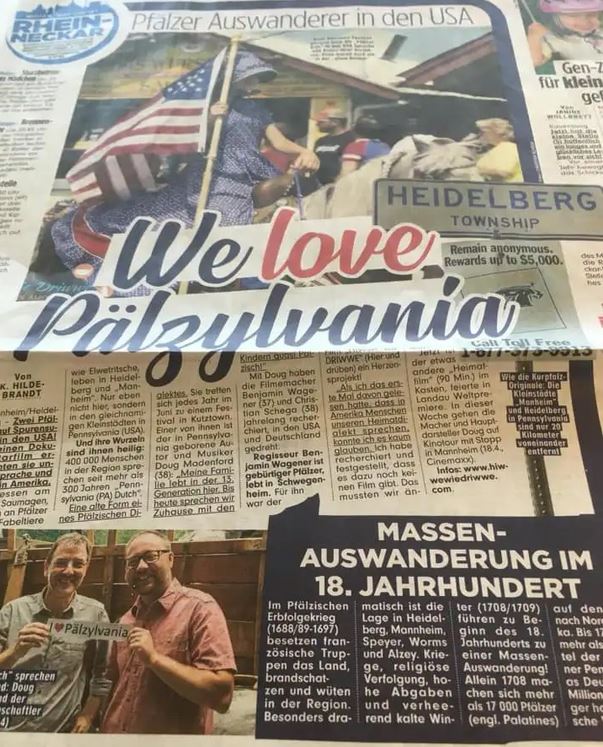 Als der südpfälzer Filmemacher Christian Schega mich 2017 kontaktierte und fragte, ob ich Interesse hätte, bei einem Filmprojekt zum Thema “Pennsylvania-Deutsch” mitzumachen, habe ich nach einer ersten Besprechung gerne zugesagt. Als Protagonist schlug ich ihm und Co-Regisseur Benjamin Wagener Douglas Madenford vor, den ich seit vielen Jahren kannte und der Co-Editor der Zeitung “Hiwwe wie Driwwe” ist. Als Deutschlehrer einer High School kennt er beide Seiten: die amerikanische und die deutsche. Und da er auf einem pennsylvanisch-deutschen Bauernhof aufgewachsen ist und den Dialekt spricht, passte er perfekt. Im Film macht er sich von Pennsylvania aus auf die Reise in die Pfalz, um nach seinen kulturellen Wurzeln zu suchen. Als sich im Laufe der Arbeiten herauskristallisierte, dass für den Film kein Name als Titel besser passt als “Hiwwe wie Driwwe”, habe ich als Rechteinhaber diesen dem gemeinsamen Projekt gerne geliehen.