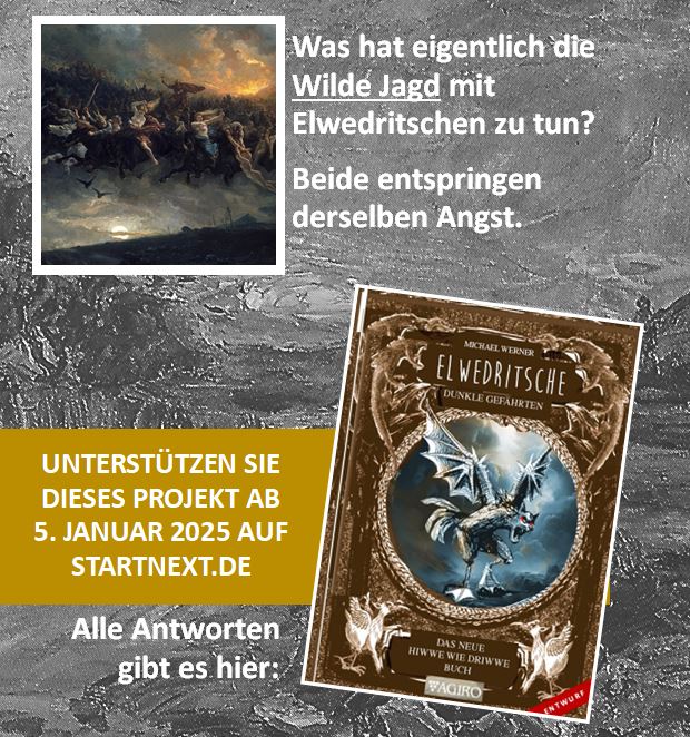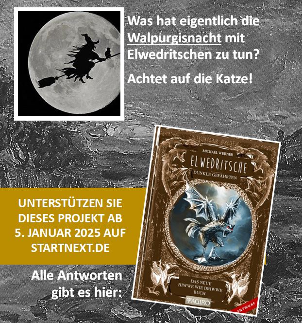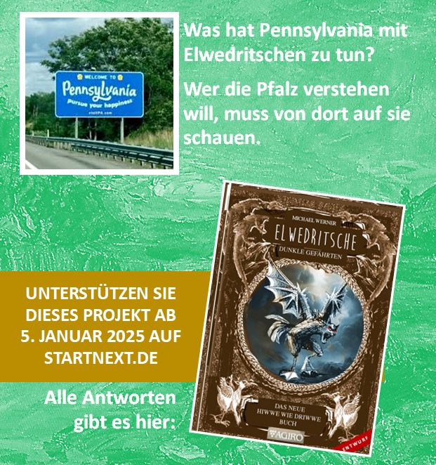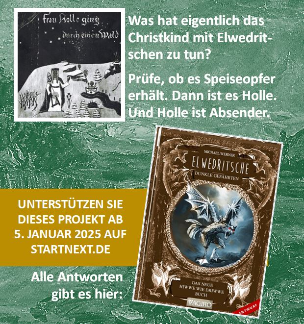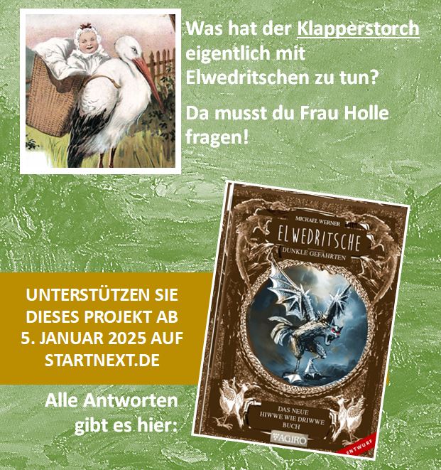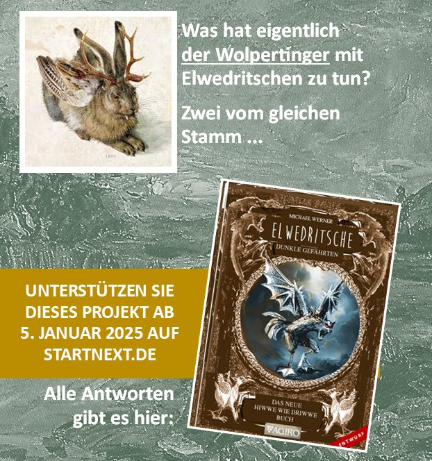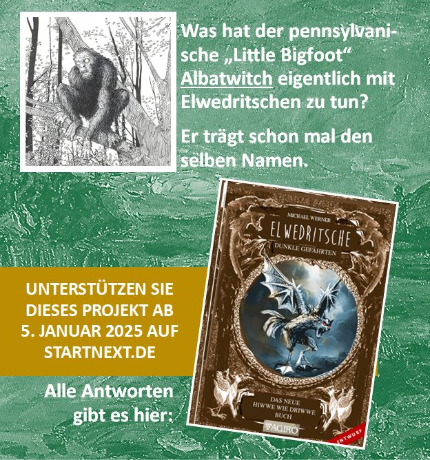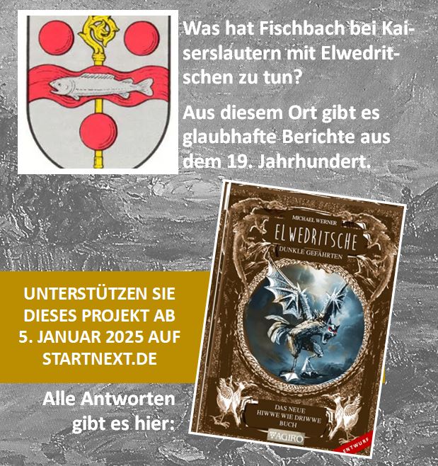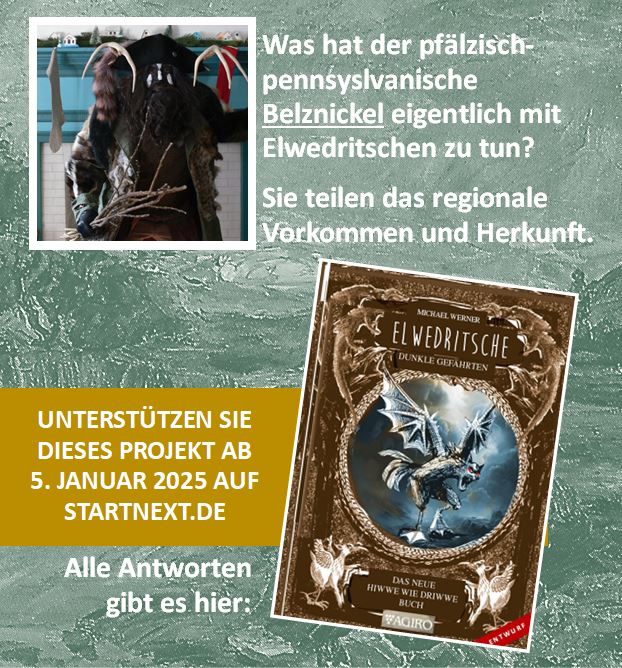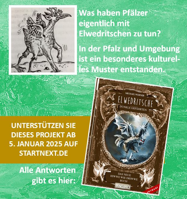 Seit Frühjahr 2025 ist das Buch “Elwedritsche – Dunkle Gefährten” in den Buchhandlungen zu erwerben, und seit kurzem ist die Website “paelzer-elwedritsche.de” online. Hier werden ergänzende Hinweise gegeben, Quellen genannt oder gleich komplett publiziert sowie interessante Links angegeben. Auf dieser Website findet auch eine fortlaufende Aktualisierung statt. Denn uns erreichen wöchentlich neue Hinweise, die das Bild vervollständigen.
