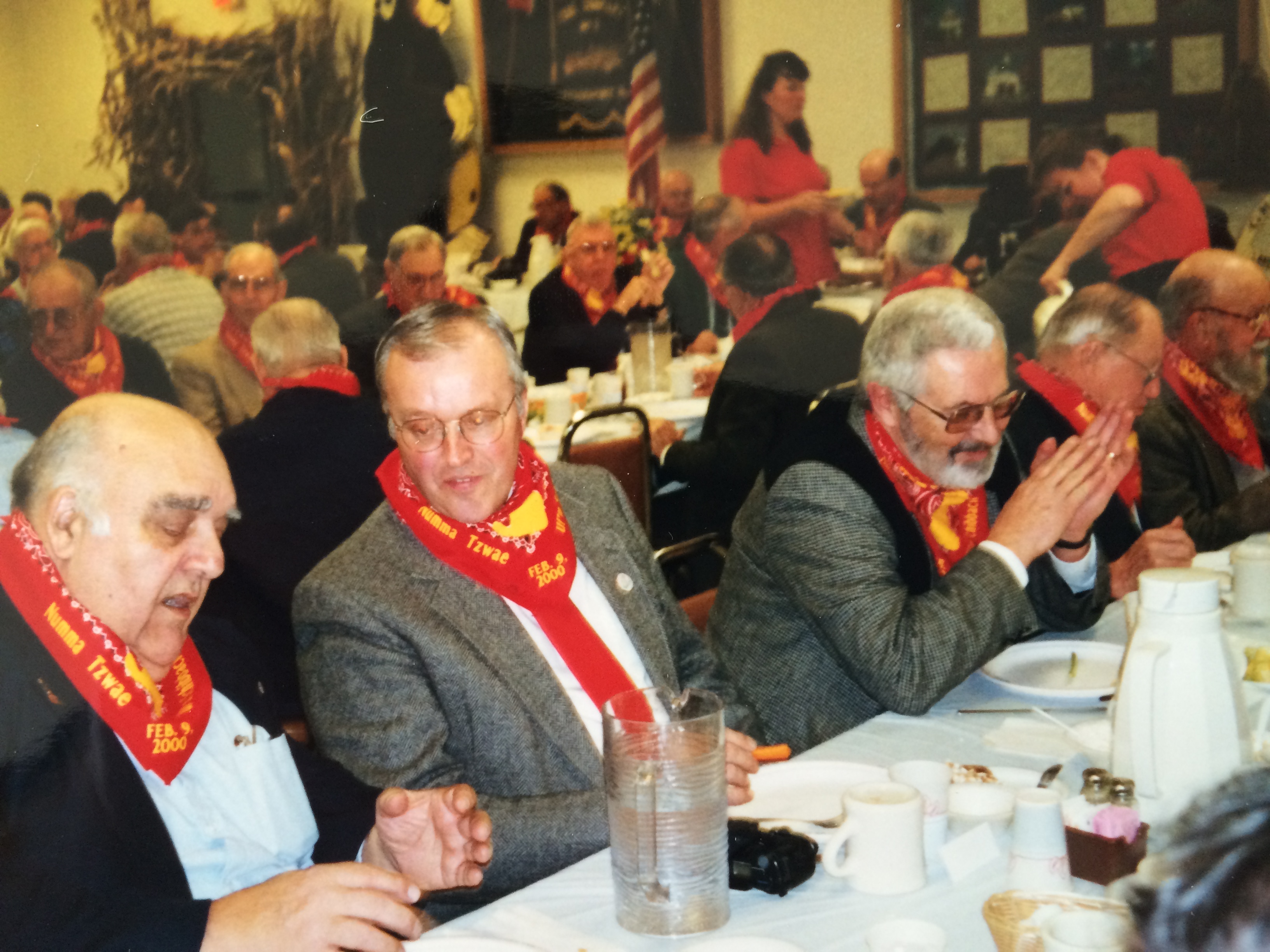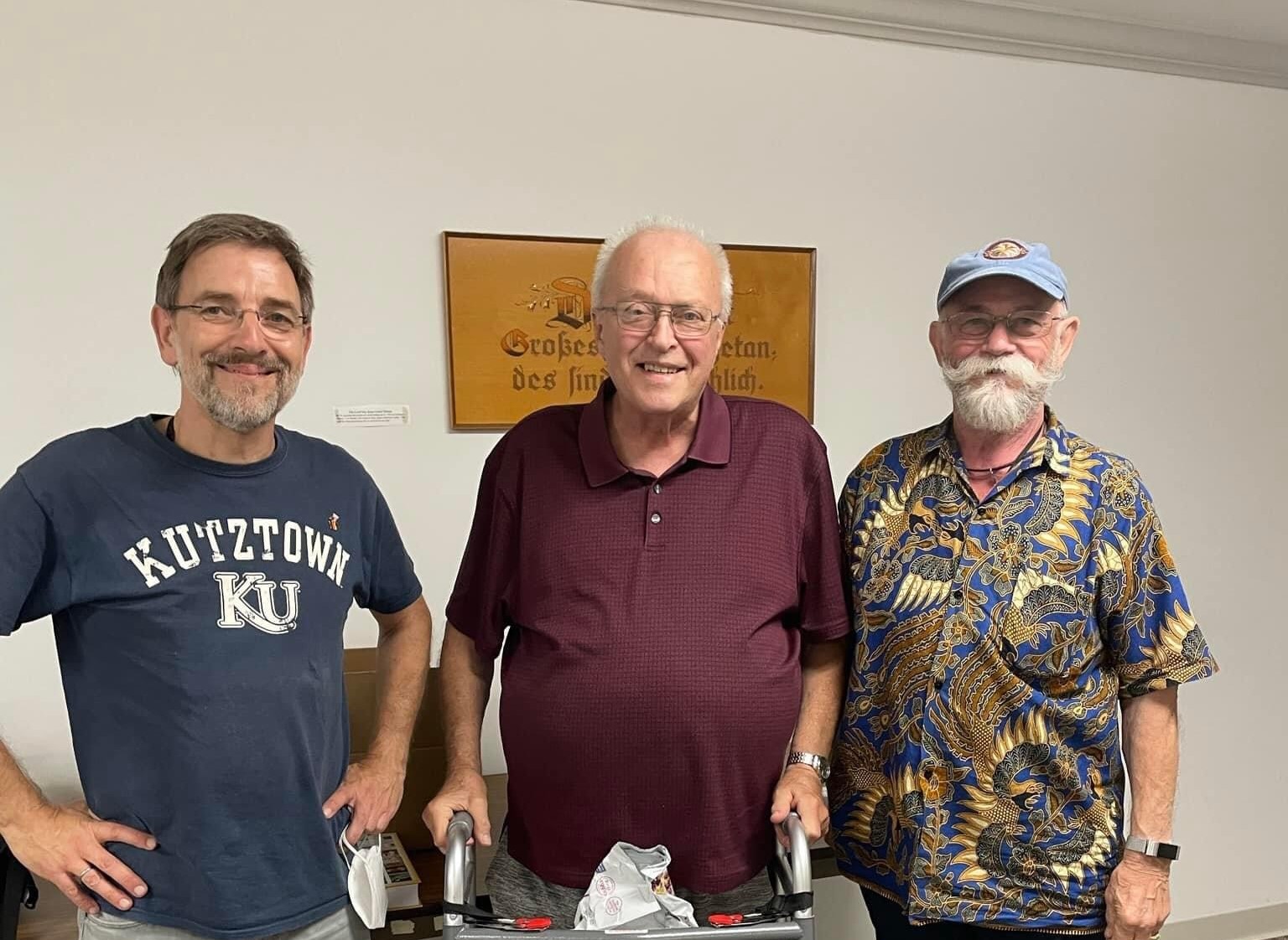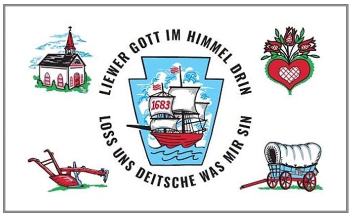 Don Breininger, damals 60 Jahre alt und einer der jüngeren „Grundsei Brieder“, war der Fahrer. Und irgendwann nach etwa einer guten Stunde in Richtung Osten in Richtung Philadelphia kamen wir am Versammlungsort an – es muss ein Feuerwehrhaus gewesen sein, wie meistens. Autos stoppten, und es stiegen ältere Herren aus, die mehr oder weniger schnell aus der Kälte ins Warme huschten – in der Hoffnung auf ein wenig „pennsylvanisch-deitscher Gschbass“ und „en guud Iems“, ein gutes deutsches Essen. Als unser Trupp den Saal betrat, kamen schnell weitere mir bekannte Gesichter auf uns zu: Carl D. Snyder (1924-2007), Paul Kunkel (1926-2020), Parre Richard Druckenbrod (1929-2003), Paul P. Bittner („Em Buppy Bittner sei Bu“, 1935-2005), Franklin D. Wanamaker (1935-2007) und aus Oley, das bis zum 1. Weltkrieg Friedensburg hieß, Parre Richard Wolf (1932-2016). Das waren Mitte der 1980er Jahre treibende Kräfte, die die in die Jahre gekommene Bewegung der „Groundhog Lodges“ neu beleben wollten. 1933 als Reaktion auf die Machtübernahme der Nationalsozialisten in Berlin gegründet, um Amerika zu zeigen, dass Pennsylvania-Deutsche patriotische Landsleute sind, befand sich die Initiative nach Ableben der ersten Generation von Grundsau-Brüdern spätestens ab Mitte der 1980er Jahre im Niedergang. Zu diesem Zeitpunkt fanden sich die Genannten und viele andere zusammen und führten Wiederbelebungsmaßnahmen durch. Man gründete eine „Groossdaadi Grundsau Lodsch“ als Dachorganisation der 18 Lodges, führte an verschiedenen Orten Sprachkurse ein, um Nachwuchsförderung zu betreiben und ließ den Künstler Peter V. Fritsch (1945-2015) die heute sehr bekannte „Pennsylvania Dutch Flag“ entwickeln. Diese wurde 1989 offiziell von den Groundhog Lodges anerkannt.